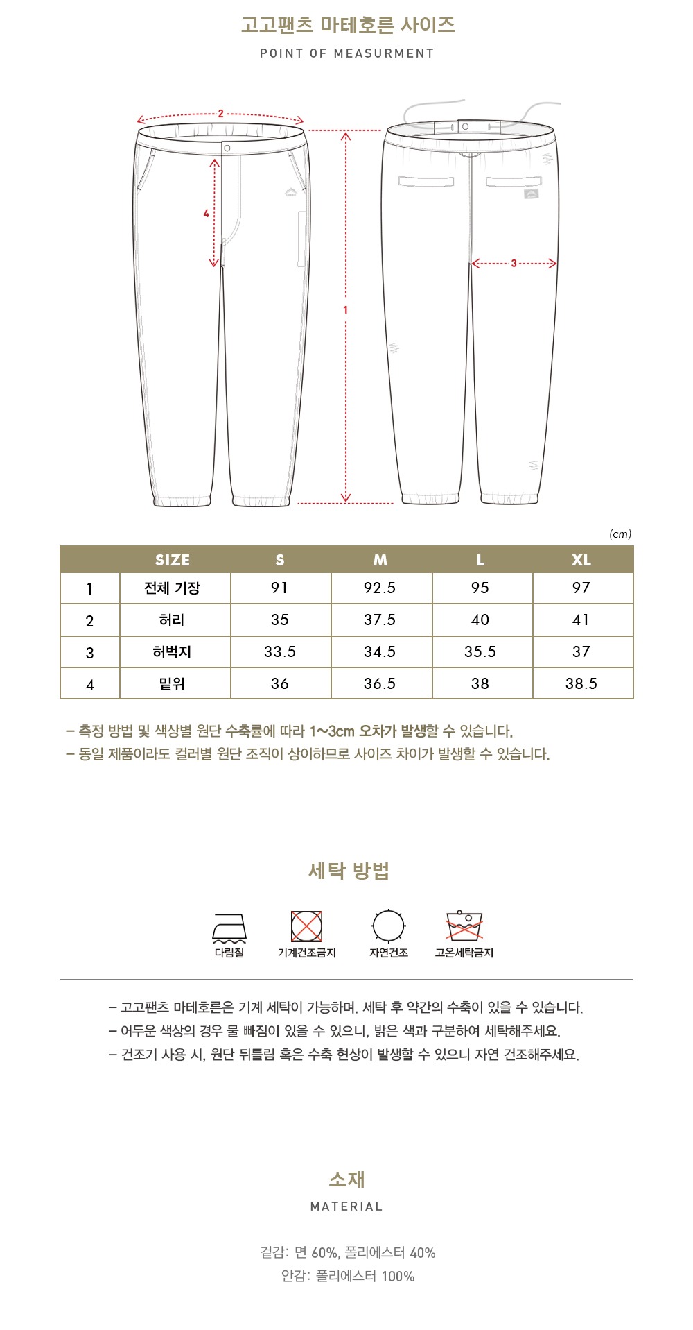 * 짙은 컬러 상품의 경우 표면에 하얀 가루가 묻어날 수 있으나 세탁 후 사라지며,